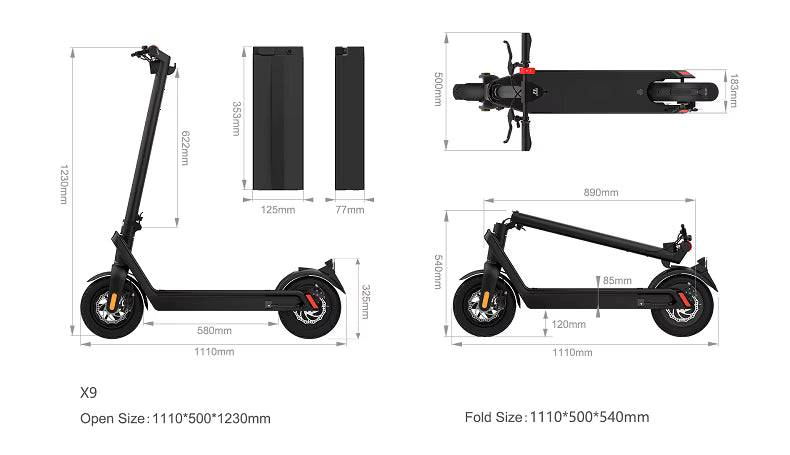 Dimensions compactes, design pliable et structure renforcée : la X9 s’adapte à tous les trajets, de la ville aux terrains difficiles.